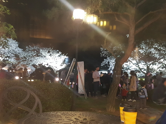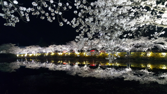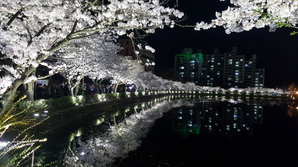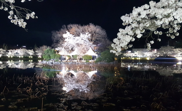 연화지는 낮에만 아름다운 것이 아니라 밤에도 절경이다. 야간에는 벚꽃을 향해 조명등을 밝혀 진짜 벚꽃과 연못위에 반사된 그림자벚꽃이 캄캄한 어둠속에 하얗게 데칼코마니를 이뤄 상춘객들의 탄성을 자아내게 만든다.