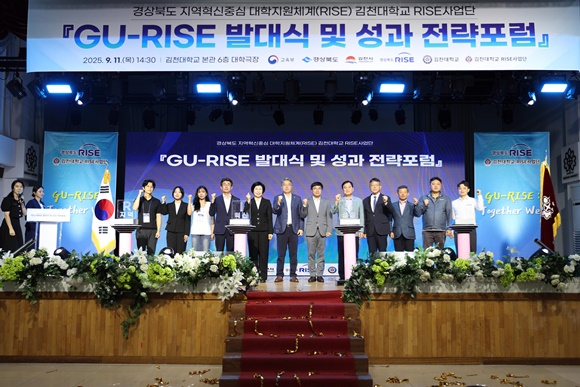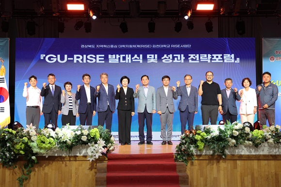 김천대학교(총장 윤옥현) RISE사업단은 11일 오후 본관 6층 대학극장에서 ‘GU-RISE 발대식 및 성과 전략 포럼’을 진행하였다. 이번 행사는 교육부와 경상북도, 경북RISE센터가 주최하고 김천대학교가 주관했으며, 김천시 및 의회, 경상북도의회, 경북보건대학교를 비롯한 혁신 공공기관, 지역 산업체, 보건기관, 청년 및 학생 단체 등 산·학·관·공·연·민 관계자 200여 명이 참석하여 성황리에 개최되었다.