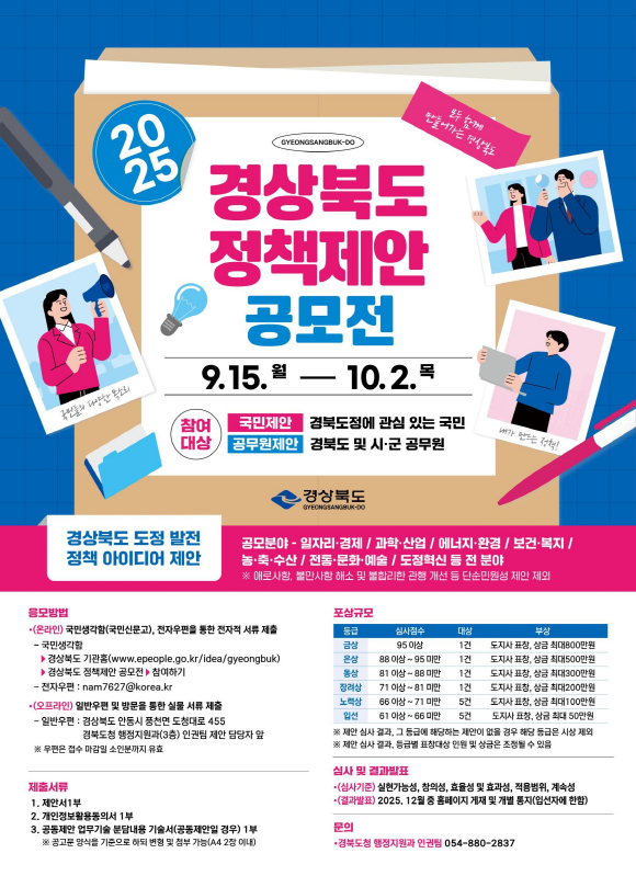 경상북도는 9월 15일부터 10월 2일까지 다양하고 창의적인 아이디어를 발굴해 도정 발전과 제도 개선에 반영하기 위해 ‘2025년 경상북도 정책 제안 공모전’을 개최한다.