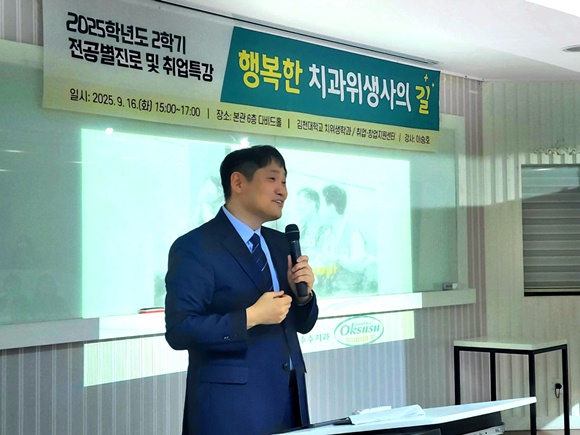 김천대학교 치위생학과는 옥수수치과의원 이승호 대표원장을 초청해 「행복한 치과위생사의 길」을 주제로 진로 및 취업 특강을 개최했다고 17일 밝혔다. 치과위생사의 직업적 가치와 미래 비전을 학생들에게 제시하는 뜻깊은 시간이 되었다.