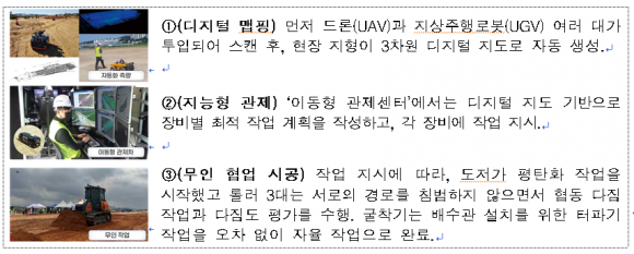 그동안 한국도로공사는 ‘수도권제2순환고속도로 김포-파주 건설공사 1공구’('23년), ‘경부고속도로 신탄진휴게소 하이패스IC 설치공사’('24년) 등의 실제 사업에 해당 기술을 적용해 왔으며, 작년까지는 건설장비 각각의 무인화 작업만 가능했다면 올해는 기술개발을 통해 다종 장비의 협동·군집 작업이 가능하게 됐다.