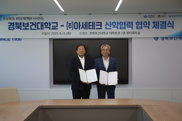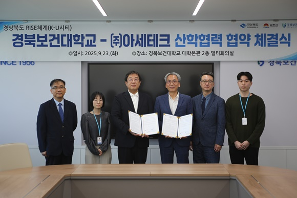 경북 김천 경북보건대학교(총장 이은직)는 09월 23일 경기도 성남 소재 ㈜아세테크(대표이사 박종석)와 물류·유통 비즈니스 및 학과 교육 협력을 위한 업무협약(MOU)을 체결했다고 밝혔다.