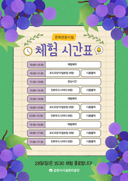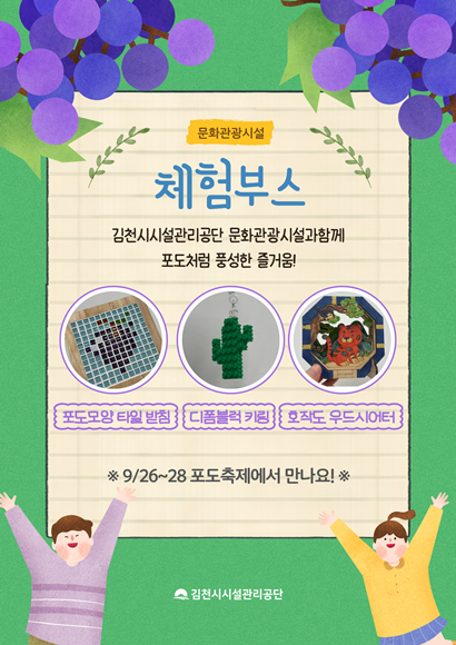 김천시시설관리공단은 오는 9월 26일부터 28일까지 김천 종합운동장에서 열리는 ‘2025 김천 포도축제’에 참여해 문화관광시설 체험부스를 운영한다.