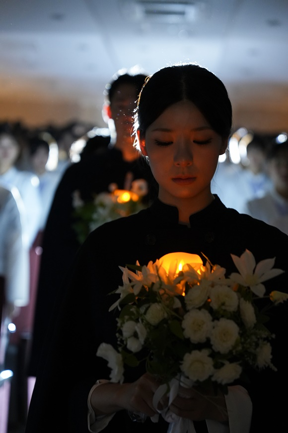 나이팅게일의 정신을 기리며, 경북보건대 간호학부 학생이 촛불과 꽃을 들고 간호인의 길을 약속하고 있다.