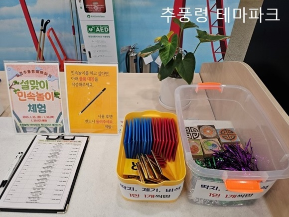 ▲ 놀이시설 할인 및 행사 10월 5일(일)부터 9일(목)까지는 추풍령테마파크와 사계절썰매장에서 할인 및 문화행사가 시행되며 추석당일은 휴무이다. 추풍령테마파크에서는 김천시 봉산면에 위치하며 추풍령 휴게소와 인접하여 연휴 중 많은 이용객이 방문할 것으로 기대된다. 이에 힘입어 ‘추억의 종이 뽑기판 행사’를 열어 선착순 400명에게 무료 체험권, 할인권, 기념품 등을 증정한다. 또 제기·딱지·투호 던지기 등 전통놀이 체험도 함께 진행된다.