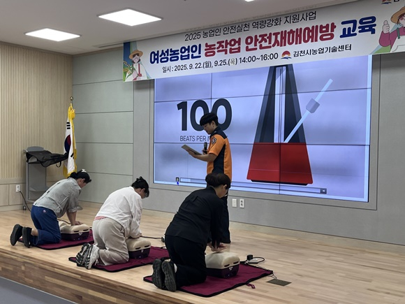 김천시는 관내 여성농업인들의 농작업 안전 역량을 강화하기 위해 9월 22일(월)과 9월 25일(목), 두 차례에 걸쳐 ‘여성농업인 농작업 안전재해예방 교육’을 실시했다고 밝혔다. 이번 교육에는 100여 명의 여성농업인이 참여했다.