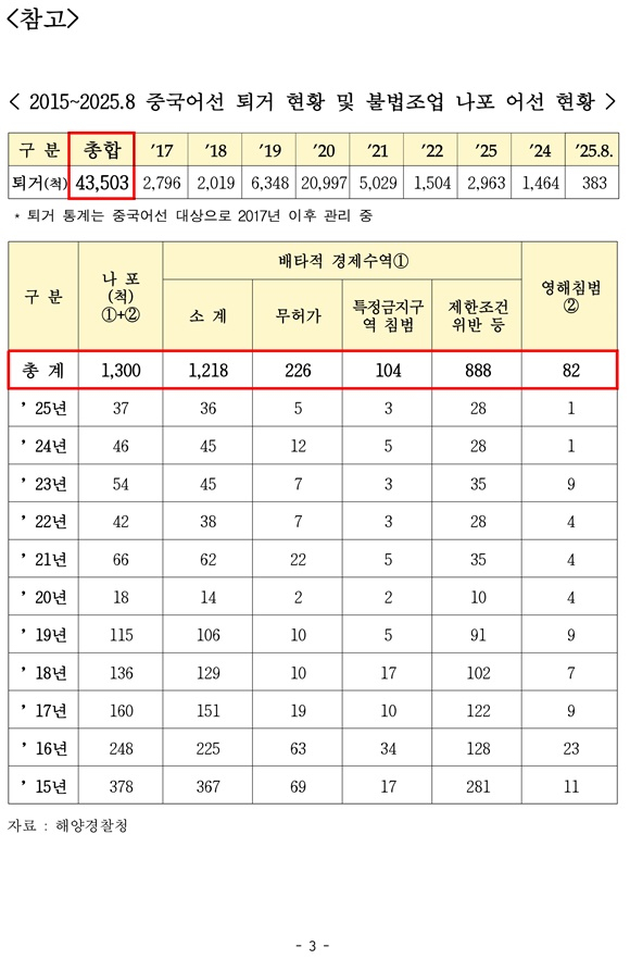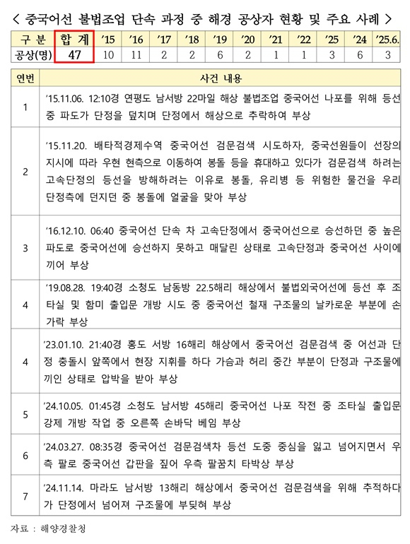 국민의힘 송언석 원내대표(경북 김천·3선)가 외교부와 해양경찰청으로부터 제출받은 자료에 따르면, 최근 10년간 우리 해역에서 나포된 중국 불법어선은 총 1,300척에 달했다. 이 과정에서 단속에 투입된 해경 47명이 부상을 입고, 특수공무집행방해 사건도 18건이 발생했다. 2016년 인천 소청도 해상에서는 중국 어선이 단속 고속단정을 고의로 들이받아 침몰시키는 사건까지 벌어진 바 있다.