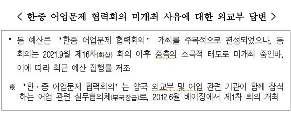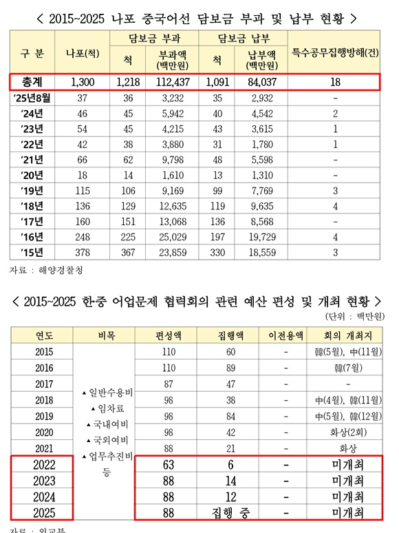 또한, 같은 기간 중국 불법 어선에 부과된 담보금은 1,124억 원에 달했다. 그러나 UN해양법협약(UNCLOS)등 국제조약과 현행 제도상, 담보금을 납부하면 선박을 돌려받을 수 있는 구조여서, 석방된 중국 선박이 다시 우리 해역에 들어와 불법조업을 벌일 우려가 높은 상황이다. 실제로 송언석 원내대표가 해양경찰청으로부터 제출받은 자료에 따르면, 나포된 1,300척의 중국어선 중 1,091척이 담보금을 납부하고 석방된 것으로 나타났다. 그럼에도 불구하고, 외교부는 불법조업 근절을 위한 핵심 외교 채널을 수년째 가동하지 못하고 있는 것으로 드러났다. 외교부가 송언석 원내대표에게 제출한 자료에 따르면, 중국 불법조업 문제를 다루는 핵심 정례 협의체인 ‘한·중 어업문제 협력회의’는 2021년 9월 제16차 화상회의 이후 지금까지 4년째 단 한 차례도 열리지 않았다. 또한. 외교부는 회의체를 가동하지 못한 이유에 대해 “중국이 소극적 태도를 보여 회의를 개최하지 못했다”는 답변만 내놓은 것으로 확인됐다. 국민 안전과 주권 수호가 걸린 사안에서 주무 부처가 상대국의 태도 탓만 하는 것은 무책임의 극치라는 비판이 제기된다. 예산 문제도 심각하다. 외교부는 ‘한·중 어업문제 협력회의’ 개최를 위해 2015년부터 2025년까지 총 10억 1,600만 원을 배정받았다. 그러나 실제 집행률은 매우 저조한 것으로 나타났다. 회의가 열리지 않았던 2022년에는 배정된 6,300만 원 가운데 600만 원만 사용됐고, 2023년에도 8,800만 원 중 1,400만 원, 2024년에는 1,200만 원만 집행되었으며 대부분의 예산이 불용된 것으로 확인됐다. 송언석 원내대표는 “10년간 1,300척의 중국 불법어선 나포, 해경 47명 부상이라는 참혹한 현실 앞에서 외교부가 내놓은 답은 ‘중국이 소극적이라 못 했다’는 무책임의 극치뿐이었다”며, “이는 직무유기를 넘어 국민과 국가 주권을 방기한 것”이라며 “외교부는 즉각 협의체를 재개하고, 우리 국민과 어민들의 희생을 막을 수 있는 실효적인 외교적 대책을 마련해야 한다”고 촉구했다.