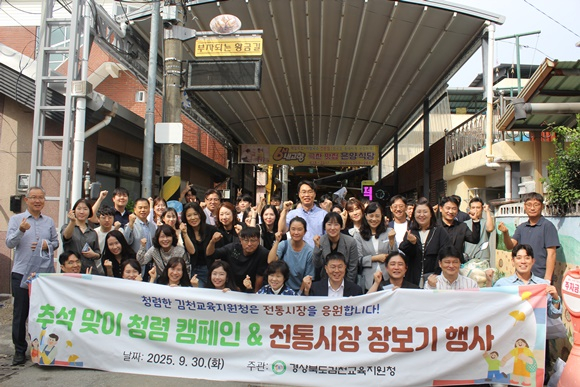 경상북도김천교육지원청은 2025년 추석 명절을 앞두고 9월 30일(화) 황금시장에서 ‘추석맞이 전통시장 장보기 행사’를 실시하였다. 이번 행사는 물가 안정과 지역경제 활성화를 도모하는 동시에, 청렴한 공직문화를 확산하고 상생의 가치를 실천하기 위해 마련됐다.