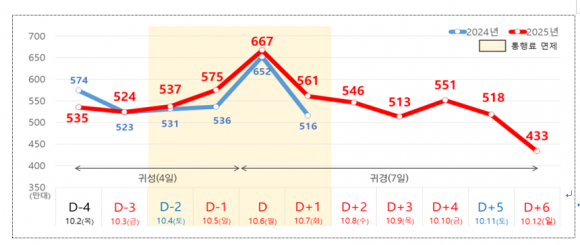대책기간 동안 고속도로 총통행량은 5,962만대(일평균 542만대)이며, 일평균 최대교통량은 추석 당일인 10.6(월) 667만대로 전망된다.