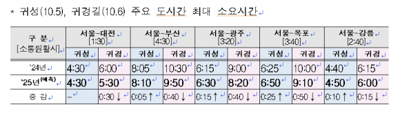 주요 도시간 이동이 가장 오래 걸리는 날은 귀성·귀경길 각각 10.5(일)과 10.6(월)로 예상된다.