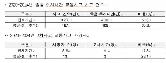 연휴 기간에는 장거리·장시간 운전으로 인한 피로누적, 집중력 저하로 졸음운전과 2차사고에 취약하다. 최근 5년간(‘20~‘24년) 설·추석 연휴 사고 건수는 167건이며 이중 졸음·주시태만으로 인한 사고는 109건으로 65.3%를 차지한다. 최근 5년 명절 기간 교통사고 사망자는 총 13명이며, 이중 일반사고보다 치사율이 6배가 넘는 2차사고 사망자는 3명이다.