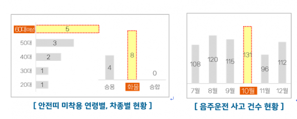 최근 3년간(’22~’24년) 10월 안전띠 미착용 사망자는 12명*으로 연중 최다이며, 기간 중 10월 사망자(52명)의 23%를 차지한다. 연령별로는 60대 이상이 5명, 차종별로는 화물차 안전띠 미착용 사망자가 8명으로 가장 많았다. 또한, 10월 음주 사고 건수 역시 연중 최대(9.2%, 131/1,424건)로 나타났다.