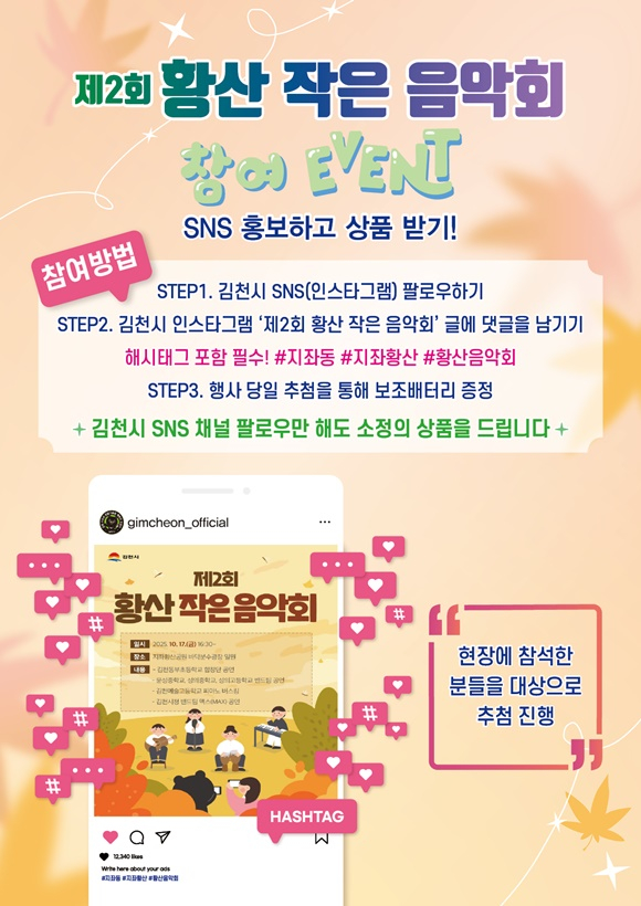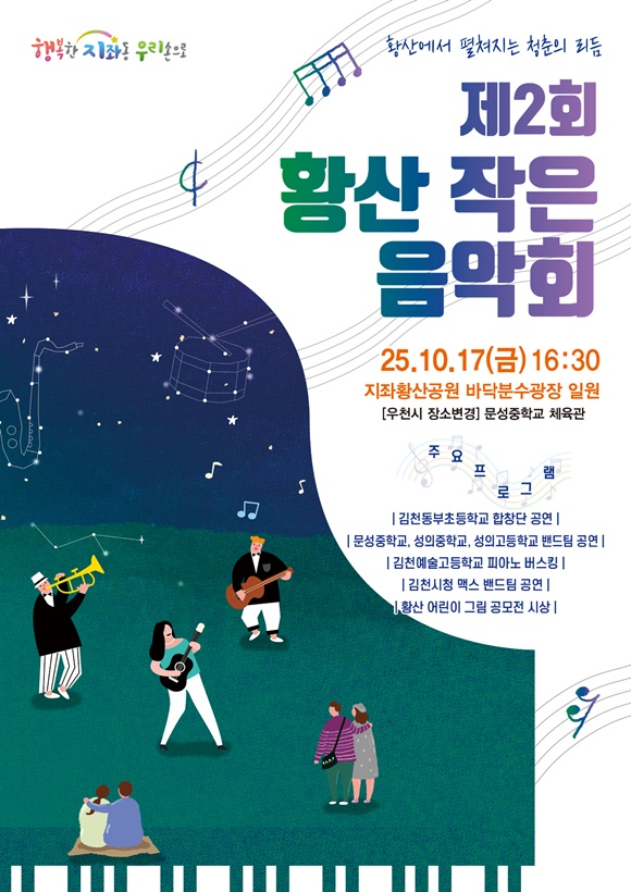 이번 음악회는 지역 청소년들에게 문화예술 활동의 장을 제공하고, 세대 간 소통·화합의 장을 마련하고자 지좌동 문화예술행사 사업으로 진행된다. 공연에는 지좌동 관내 김천동부초등학교 합창단, 문성중학교·성의중학교·성의고등학교 밴드팀, 김천예술고등학교 피아노 버스킹, 김천시청 밴드팀이 참여하며, 신나는 밴드 연주, 조화로운 합창, 수준 높은 피아노 공연 등 다채로운 무대를 통해 시민들에게 풍성한 볼거리를 제공할 예정이다.