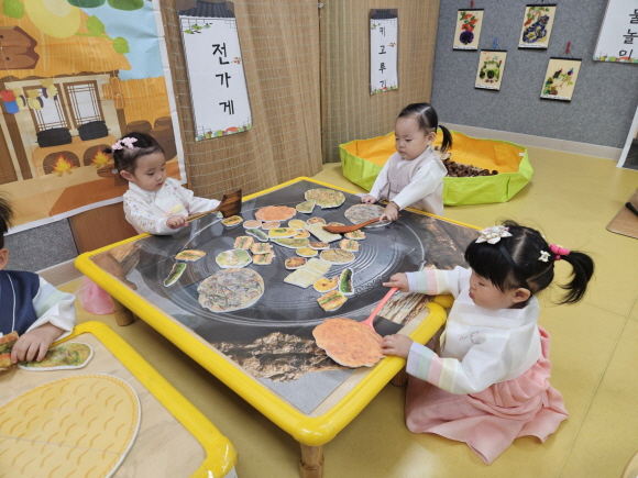 어린이집에서는 추석 명절을 맞이하여 한복을 차려입고 송편 만들기, 전 만들기, 차례 지내기, 전통 민속놀이 체험하기 등 다양한 프로그램을 진행하며 풍성한 음식을 나누고 가족과 함께하는 명절의 의미를 되새기는 시간을 가졌다.
