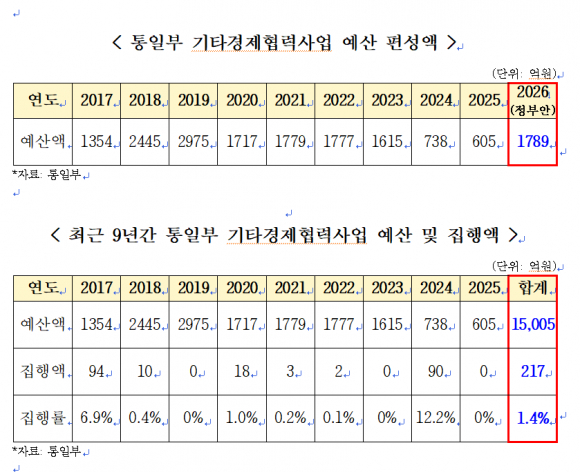 통일부는 내년도 남북협력기금 사업 중 ‘경제협력사업’ 예산을 1,789억원으로 올해(605억원) 대비 1,184억원 증액하여 국회에 제출했다. ‘경제협력사업’은 남북 합의를 통해 철도·도로 연결 인프라를 구축하거나, 정부가 추진하는 남북 교류협력기반 조성사업에 소요되는 경비를 무상 지원하는 사업이다. 최근 9년간(2017년~2025년) 편성된 경제협력사업 예산 1조 5,005억원 중 집행된 예산은 217억원으로 집행률이 1.4%에 불과한 것으로 나타났다.