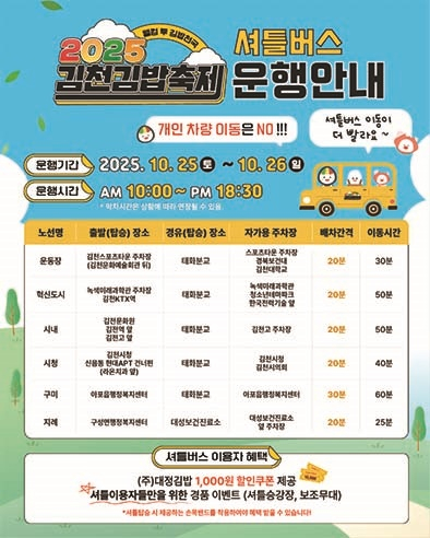 전국적인 관심을 모은 김천 김밥축제는 올해 더욱 새로워진 구성으로 열린다. 3개의 김밥존(명품 김밥존, 이색 김밥존, 이벤트존)으로 운영되며, 김밥 창작소, 로컬 김밥 체험, 이색 김밥 체험존 등 참여형 프로그램으로 남녀노소 함께 즐기는 음식 축제로 주목받고 있다.