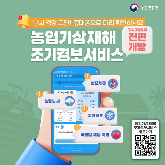 농업기상재해 조기경보서비스는 기상청이 제공하는 동네예보(5×5km) 정보를 재분석해 농장 단위(30×30m)로 맞춤형 기상재해 정보와 대응 지침을 문자나 알림톡을 통해 제공하는 서비스로 농업인 누구나 가입하여 이용할 수 있다.