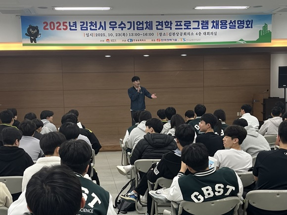 ‘청년 꿈 job고, 내 일 job고’라는 주제로 진행된 이번 설명회에서는 코오롱이앤피㈜, 코오롱생명과학㈜, ㈜태동테크, ㈜계양정밀, ㈜우진산전, ㈜알앤알코리아의 채용 설명과 취업 특강을 통해 기업 현장의 생생한 정보를 전했다. 행사장에는 면접 부스를 운영하여 실제 채용 수요가 있는 기업과 구직자 간 1:1 현장 면접이 진행됐으며, 그 외 기업들은 인사 담당자의 모의 면접으로 구직자들의 실전 감각을 높였다. 또한 전 국가대표 축구선수 조원희를 초청해 꿈과 목표를 향한 도전과 경험을 나누며 청년들의 뜨거운 호응을 이끌어냈다. 「김천시 우수 기업체 견학 프로그램」은 김천시가 주최하고 김천상공회의소가 주관하는 지역 산업체 탐방 프로그램으로, 관내·외 구직자가 직접 기업 현장을 방문해 지역 우수기업을 이해하고 취업 의지를 높일 수 있도록 지원하고 있으며 2023년부터 운영 중이다. 한편, 올해는 참여 대상을 타지역 특성화고 학생 등으로 확대해 외부 인력의 유입과 지역 내 인재 확보를 병행하고 있으며, 견학 프로그램은 오는 11월까지 지속될 예정이다.