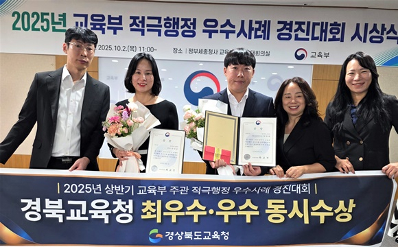 경북교육청(교육감 임종식)은 2025년 상반기 교육부 주관 적극행정 우수사례 경진대회에서 시도교육청 부문 최우수상과 우수상을 공동 수상하는 쾌거를 거두며, 전국 시도교육청 중 가장 많은 수상 실적을 보유한 적극행정 선도기관으로 자리매김했다고 27일 밝혔다.