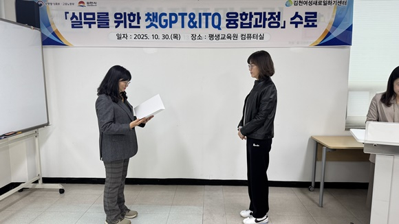 김천여성새로일하기센터(센터장 김인수)는 지난 30일, 취업을 희망하는 경력 단절 여성 20명을 대상으로 진행한 직업교육훈련 ‘실무를 위한 챗GPT&ITQ 융합과정’ 수료식을 개최했다.
