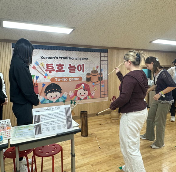 K-POP에서 전통으로 ― ‘갓·주영 만들기’와 ‘전통 놀이 체험 부스’올해 프로그램은 ‘케이팝 데몬 헌터스’의 인기를 바탕으로 한국 전통의 멋을 알리는 활동이 눈길을 끌었다. 헝가리 학생들은 ‘갓과 주영(갓끈)’을 직접 만들어보며 조선 시대 복식문화의 정교함을 배우고, 완성된 갓을 착용한 채 교내 전통 건축물 앞에서 사진을 찍으며 한국적 미를 체험했다. 또한 한일여자고등학교(김천한일고등학교) 학생들은 ‘제기차기’, ‘공기놀이’, ‘투호놀이’, ‘딱지치기’, ‘달고나 뽑기’ 등 다양한 전통 놀이 체험 부스를 운영해 헝가리 학생들에게 놀이를 통한 한국 문화의 즐거움을 전했다. 활기찬 웃음소리로 가득한 체험장은 양국 학생들이 함께 어울려 소통하는 공간이 되었다.