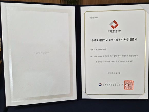 김천시 시설관리공단은 문화체육관광부와 한국출판문화산업진흥원이 주관하는 ‘제12회 대한민국 독서경영 우수 직장 인증’을 획득했다고 지난 5일 밝혔다.