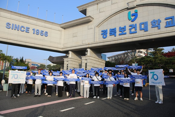 경북보건대학교(총장 이은직)는 2026년 개교 70주년을 앞두고, 지난 9일 김천종합스포츠타운 일대에서 열린 ‘2025 김천전국마라톤대회’에 동문, 교직원, 재학생 등 총 70명이 5km 코스에 단체로 참여하여 완주했다고 10일 밝혔다.