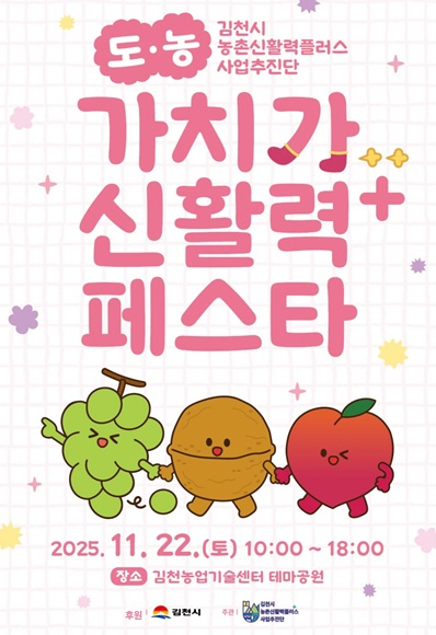 11월 22일 토요일 오전 10시부터 오후 5시까지 김천농업기술센터 테마공원에서 진행되는 이번 행사는 김천시 농촌의 새로운 활로를 모색하고, 지역 주민과 청년, 사회적경제 조직이 함께 참여하는 ‘농촌 활력 네트워크 축제’로 기획되었다.