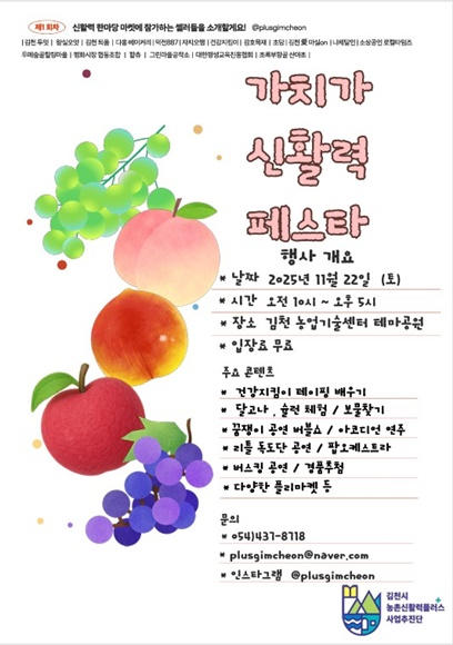 신현일 단장은 “이번 페스티벌은 그간 김천시 농촌신활력플러스사업단이 함께 추진해서 만들어가고 있는 농촌뿐 아니라 김천이 가진 매력과 잠재력을 시민들이 직접 보고 느낄 수 있는 자리”라며, “또한 지역 농산물의 판로 확대와 농촌경제 활성화에 실질적인 도움이 될 것으로 기대한다”고 전했다.