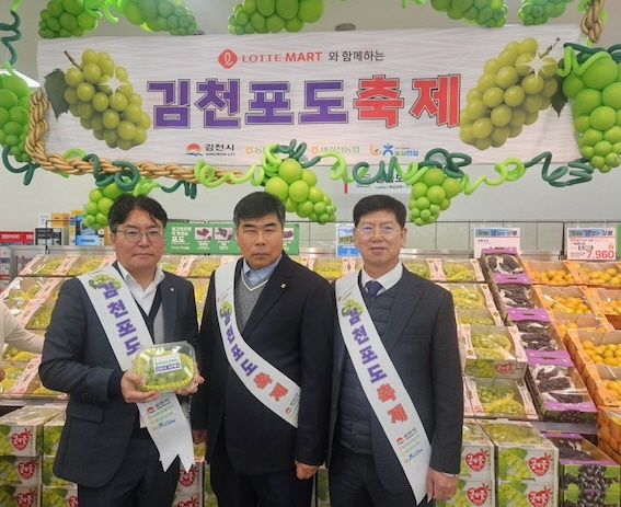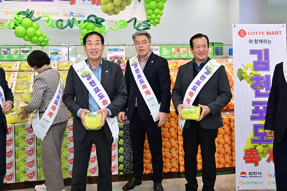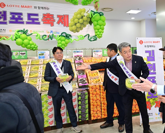 김천시는 10일 롯데마트 제타플렉스 서울역점(서울 중구)을 방문하여 ‘김천포도(샤인머스켓) 특판행사’에 직접 참여했다.