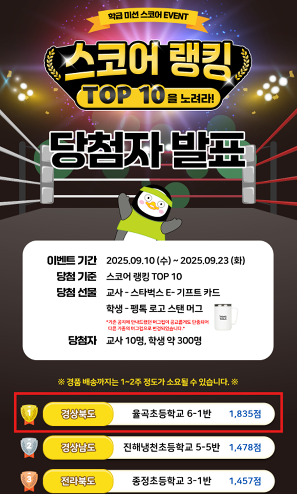 열정과 협동으로 이룬 값진 성과 이번 성과는 단순히 점수를 많이 획득한 결과가 아니다. 학생들은 매일 AI 펭톡을 통해 대화 연습, 상황 대화, 발음 교정 등의 활동을 꾸준히 이어가며 ‘꾸준함이 실력’임을 몸소 증명했다. 수업 시간뿐 아니라 쉬는 시간과 방과 후에도 자발적으로 참여하며, 친구들과 스스로 미션을 정하고 서로의 학습을 도와주었다. 율곡초 6-1반은 이렇게 쌓인 노력의 결과로 총 1,835점을 획득해 전국 학급 중 1위를 달성했다. 지난 대회 3위의 아쉬움을 딛고, 학생과 교사가 함께 세운“한 단계씩 성장하자”는 목표가 결실을 맺은 것이다.