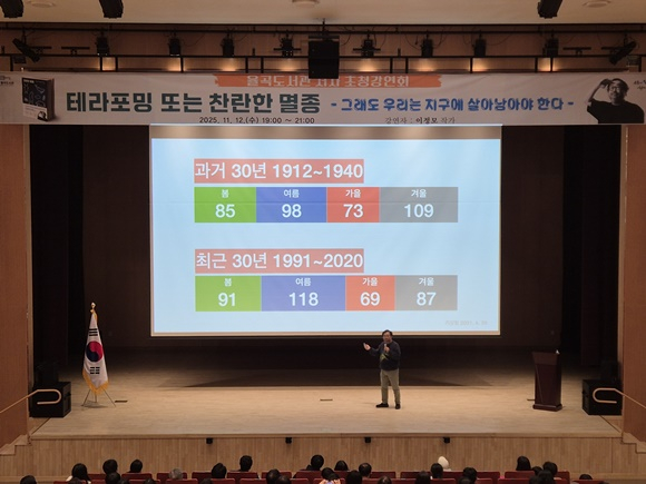 이신기 김천시립도서관장은 “이번 강연은 과학과 인문학이 만나는 뜻깊은 자리였다”라며 “앞으로도 도서관이 지구의 위기를 외면하지 않고, 함께 해결책을 모색하는 시민 교양의 장으로서 역할을 다하겠다”라고 말했다.