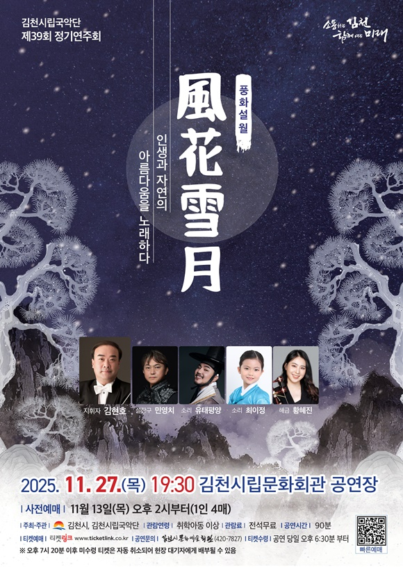 이번 정기연주회는 ‘풍화설월(風花雪月)’을 주제로 하여 인생과 자연의 아름다움을 현대적으로 재해석한 무대로 꾸며지고, 힘차고 역동적인 국악관현악 ‘천마도’를 연주를 시작으로 해금협연자 황혜진의 ‘산곡(散曲)’의 서정적인 해금 연주가 펼쳐진다. 이어지는 국악 소리꾼 유태평양과 최이정이 함께하는 판소리와 국악관현악 무대는 전통 소리의 진한 감정과 관현악의 풍성한 음색이 어우러져 관객들에게 깊은 울림을 전한다. 마지막으로 장구 명인 민영치가 출연하는 설장구협주곡이 화려한 피날레를 장식하여 장단의 역동적인 리듬과 에너지로 공연의 완성도를 더할 예정이다. 김천시립국악단은 이번 공연을 통해 전통의 아름다움과 현대적 감각이 공존하는 국악의 새로운 매력을 선보이고, 시민들에게 풍성한 문화 향유의 시간을 제공할 예정이다. 공연 시간은 약 90분 정도로 취학아동 이상 전석 무료로 관람 가능하며, 사전예매는 11월 13일 목요일 오후 2시부터 티켓링크 누리집 및 앱을 통하여 1인당 최대 4매까지 예매 가능하다. 예매한 티켓은 공연 당일 오후 6시 30분부터 현장에서 예매권 확인 후 배부한다. 다만, 공연 시작 10분 전까지 좌석권 미수령 시 해당 예매는 자동 취소되어 현장 대기자에게 배부하므로 주의가 필요하다. 자세한 사항은 김천시 문화예술회관 누리집 공지사항을 확인하거나, 문화예술회관 사무실로 문의하면 된다. 문의) ☎ 054-420-7827, 누리집 https://www.gc.go.kr/gcart