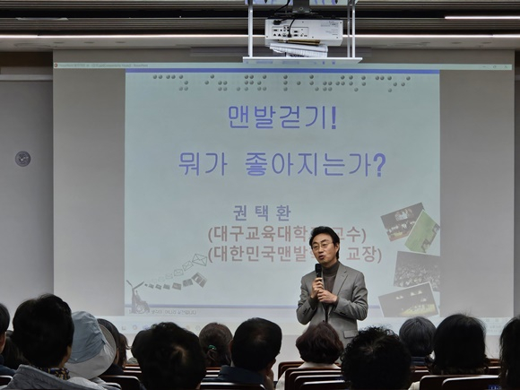 이번 강연회는 율곡동 주민자치위원회 주최·주관, 김천시 후원으로 개최되었으며, 대한민국맨발학교장 권택환 교수를 초빙하여 주민들에게 맨발걷기의 효능과 올바른 실천 방법을 알기 쉽게 소개했다. 권택환 교수는 ‘맨발걷기! 뭐가 좋아지는가?’를 주제로 영상자료와 함께 강연을 진행했다. 그는 “맨발로 걷는 것은 단순한 운동이 아니라, 뇌를 자극하여 면역력을 높이고, 흙의 음이온이 몸의 활성산소를 제거해 스트레스를 완화하는 자연 치유 활동”이라고 강조했다.