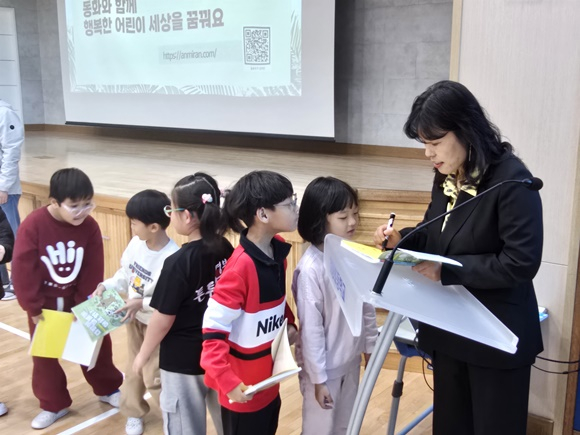 이번 행사는 학생들이 책 속 이야기를 더 깊이 이해하고, 창작 과정을 직접 듣는 특별한 경험을 제공하기 위해 마련되었다. 안미란 작가님은 작품 속 주인공과 배경이 탄생하게 된 과정, 마을과 등장인물에 담긴 의미 등을 학생 눈높이에 맞추어 흥미롭게 전달하였다. 특히 작가님은 책 속 이야기와 연결된 동물 보호, 생명 존중 교육을 함께 진행하며, 동물이 안전하게 살아갈 수 있는 환경을 만들기 위해 우리가 실천할 수 있는 행동들을 소개했다. 학생들은 평소 관심 있던 동물 보호 주제에 대해 적극적으로 질문하며 공감과 배려를 배우는 시간을 가졌다.
