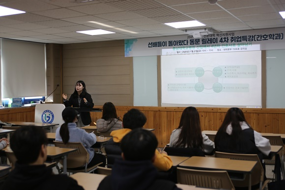 경북보건대학교(총장 이은직)는 11월 21일(금) 본관 강의실에서 간호학과 재학생을 대상으로 「선배들이 돌아왔다 동문 릴레이 취업특강」 4차 프로그램을 성공적으로 개최했다고 밝혔다.