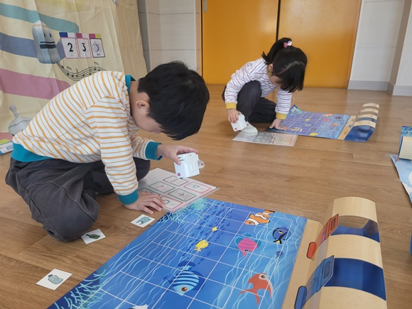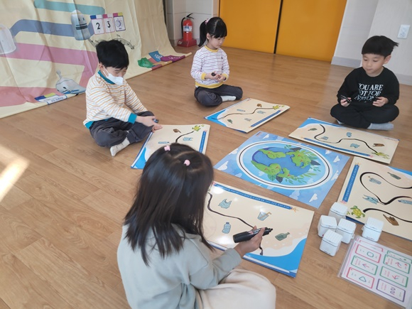 이어서 로봇을 활용해 오염된 바다를 깨끗하게 만드는 ‘바다 지키기’ 코딩놀이 미션을 시작했다. 유아들은 로봇이 바다의 쓰레기를 싣고 분리수거 구역으로 갈 수 있도록 코딩카드를 선택하고 순서를 조합해 이동 경로를 설계했다. 로봇이 곳곳에 있는 장애물을 피할 수 있도록 다양한 시도를 하며 유아들은 스스로 문제를 해결하는 즐거움과 성취감도 느낄 수 있었다. 코딩놀이 후 깨끗한 바다가 나타나자 유아들은 “바다가 이제 깨끗해졌어요!”, “로봇이 분리수거를 해서 바다 동물들이 아프지 않아요!”라고 소감을 이야기하며 크게 기뻐하는 모습이었다. 김천신일초병설유치원은 2025학년도 유치원 특색있는 교육과정 운영으로 유아들의 디지털 기초 소양을 기르는 코딩놀이를 실시하여 유아들의 디지털 놀이를 확장하고 문제해결능력을 기를 수 있도록 지속적으로 지원하고 있다.
