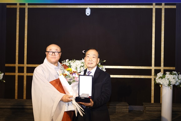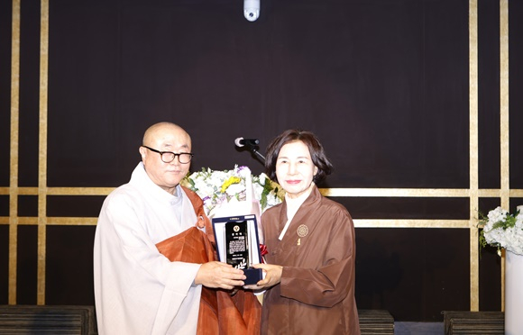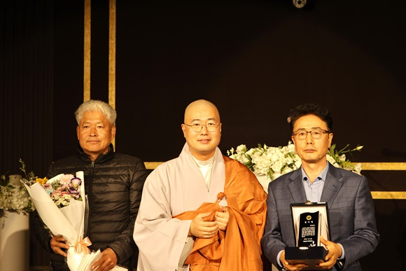 법회 후반부에는 감사패 전달식이 거행되어, 용화사 주지 원봉 스님이 한 해 동안 헌신한 이들에게 감사의 뜻을 전했다. 이어 직지사 보리수합창단이 올린 음성공양과 참석자들이 함께 부른 청법가가 울려 퍼지며 법회의 장엄함을 더했다.