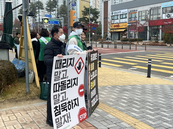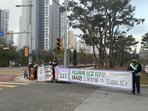 김천시청년새마을연대(회장 이동협)와 김천경찰서는 24일 아침, 율곡초등학교 및 율곡중학교 앞에서 학교폭력 근절을 위한 합동 캠페인을 전개했다.
