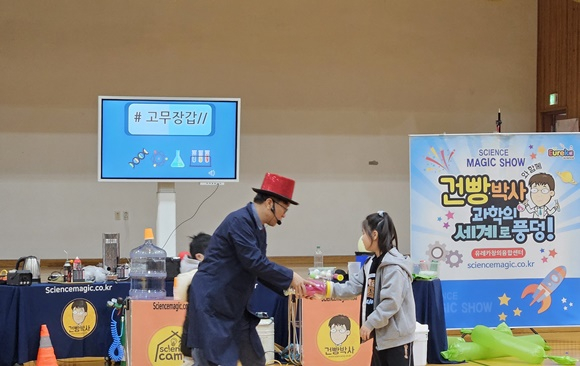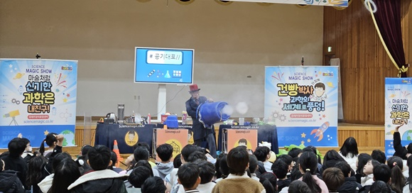 김천동부초등학교(교장 권경미)는 11월 28일(금) 2-3학년과 감천초등학교의 2-4학년 학생들이 함께하는 ‘건빵선생님 사이언스 쇼’를 황산관에서 도-농 이음 교육의 일환으로 개최하였다. 이번 쇼를 통해 학생들의 과학적 호기심과 탐구심을 한층 끌어올렸다. 과학의 원리를 단순히 보는 것을 넘어, 학생들이 직접 체험하고 반응하며 배우는 참여형 공연으로 구성됐다.