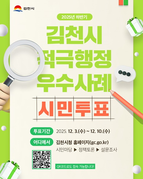 김천시는 12월 3일부터 12월 10일까지 ‘2025년 하반기 적극행정 우수공무원’선발을 위한 온라인 시민투표를 진행한다고 밝혔다.