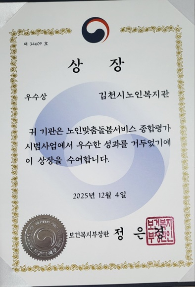 김천시노인복지관 김민종관장은 “이번 수상은 현장에서 어르신들을 위해 헌신해 온 종사자 여러분의 노력과 지역사회의 적극적인 협력이 만들어 낸 값진 성과”라며, “앞으로도 어르신들이 안전하고 건강한 노후를 보내실 수 있도록 더욱 질 높은 맞춤형 돌봄서비스 제고를 위해 힘쓰겠다”고 밝혔다.