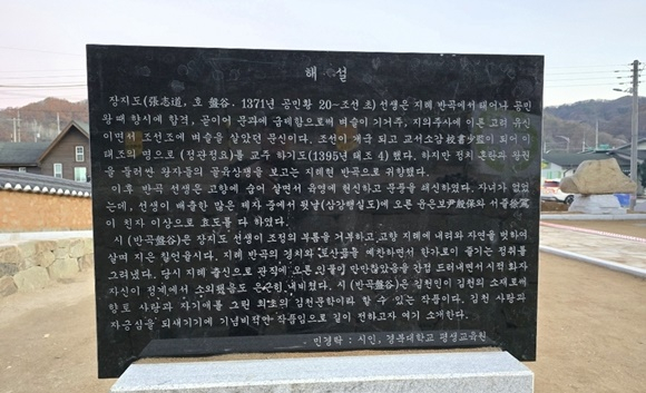 장지도(張志道)(1371~?)는 고려 말기의 문신으로, 본관은 인동(仁同), 호는 반곡(盤谷)으로 아버지는 경상도 청하현감(淸河縣監)을 지낸 장을포(張乙浦), 큰아버지는 운봉현감(雲峰縣監)을 지낸 장을해(張乙海)이며, 후손은 없다. 그는 경상도(慶尙道) 지례현(知禮縣: 지금의 金泉市 知禮面)에서 태어났으며, 어려서부터 총명하고 절의가 굳었다. 공민왕 때 향시에 합격하고 곧이어 문과에 급제하여 기거주(起居注:고려 때 門下府의 종 5품[후에 정 5품]) 지의주사(知宜州事: 宜州의 사무를 관장하는 知事)가 되어 명망을 얻었다. 조선을 건국한 태조는 1395년(태조 4) 교서소감(校書少監)인 그에게 『정관정요(貞觀政要)』를 교정하게 하였다. 장지도는 예조의랑으로 있던 정혼(鄭渾)과 함께 교정 업무를 성실하게 수행하였으나 왕자들의 권력 싸움으로 골육상쟁을 목도하면서 정치에 염증을 느껴 벼슬을 버리고 김천 지례현으로 낙향해 은거하였다.