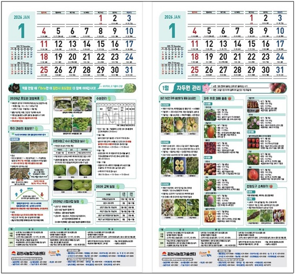 이번에 제작된 재배 매뉴얼 달력은 샤인머스켓 5,500부, 자두 3,500부로, 김천시에 주소를 두고 농업경영체로 등록된 포도·자두 재배 농가를 대상으로 배부된다. 달력은 농업인이 영농 현장에서 시기별로 필요한 정보를 손쉽게 확인할 수 있도록 실용성과 가독성을 높인 벽걸이형으로 제작되었다. 달력에는 월별 주요 농작업 일정과 재배 관리 요령을 비롯해, 생육 단계에 따른 비배 관리 방법, 시기별 주요 병해충 발생 양상과 방제 요령 등 과수 재배 전반에 걸친 핵심 정보가 종합적으로 수록되어 있다. 특히, 현장 경험과 지역 재배 여건을 반영한 맞춤형 내용으로 구성되어 농가의 영농 의사결정에 실질적인 도움이 될 것으로 기대된다.