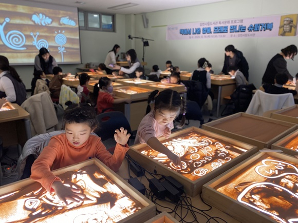 이번 행사는 김천시립도서관 본관에서 총 2회에 걸쳐 진행되었으며, 효동어린이집과 한걸음어린이집 원아 등 총 60명이 참여했다. 행사는 유설화 작가의 인기 그림책 「슈퍼거북」을 바탕으로 한 샌드아트 공연과 샌드아트 체험 프로그램으로 구성됐다. 아이들은 책 속 이야기를 모래 그림으로 감상하고, 직접 샌드아트를 표현해 보며 독서와 예술을 함께 체험하는 뜻깊은 시간을 가졌다. 특히 이야기의 흐름에 맞춰 완성되는 샌드아트는 참여 아동들의 큰 호응을 얻었다.