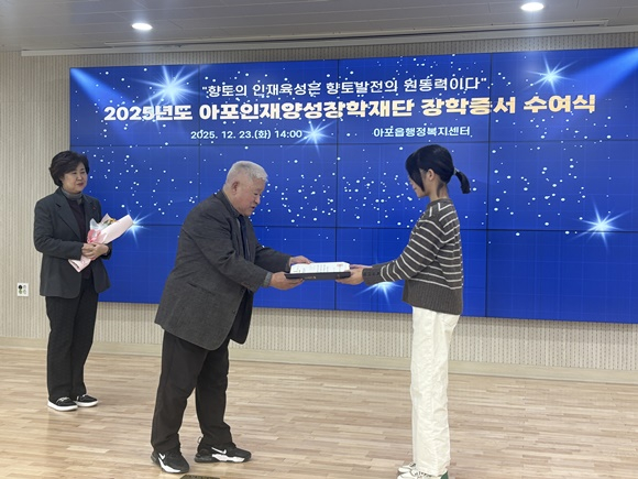 아포인재양성장학재단은 2006년 지역 인재 육성을 목표로 ‘뜻모아! 힘모아!’라는 슬로건 아래 설립됐으며, 설립 이후 지역 주민과 단체의 꾸준한 참여로 현재까지 236명이 총 약 3억2천5백만 원의 장학 성금을 기탁해 363명의 학생에게 총 약 1억2천8백만 원의 장학금을 지원해 왔다.