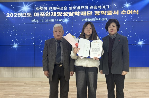 김천시 아포인재양성장학재단(이사장 강타관)은 지난 23일 아포읍 행정복지센터 강당에서 아포인재양성장학재단 강타관 이사장, 이서정 아포읍장, 성기호 아포농협조합장 등 40여 명이 참석한 가운데 2025년 장학증서 수여식을 개최했다.