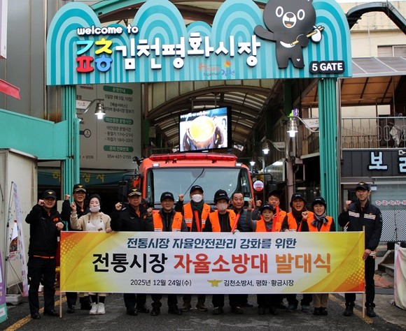 김천소방서(서장 송영환)는 24일, 김천시 평화시장에서 '전통시장 자율소방대 발대식'을 개최하고 전통시장 화재 예방 및 초기 대응 역량 강화에 나섰다.