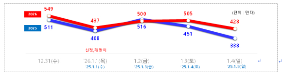 한국도로공사(사장 함진규)는 ’25년 12월 31일(수)부터 ’26년 1월 4일(일)까지 5일간 해맞이 특별교통대책을 운영한다고 밝혔다. 연휴 기간 전국 고속도로 교통량은 전년(445만대/일)보다 8.8% 증가한 일평균 484만 대로 예상되며, 최대 교통량은 12월 31일(수) 549만 대가 예상된다.